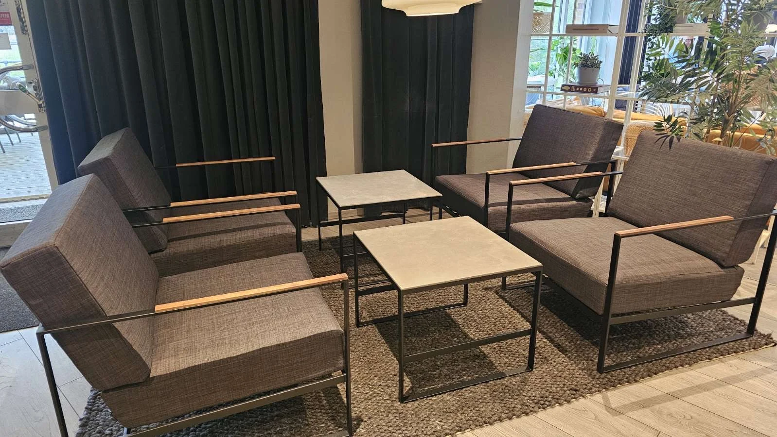 Stolar och bord i rostfritt för utomhusbruk. Dynor ej regntåliga. Stommen på bilden är pulverlackad i svart struktur men går givetvis att få i andra kulörer. Stol 13990 kr Bord 4990 kr